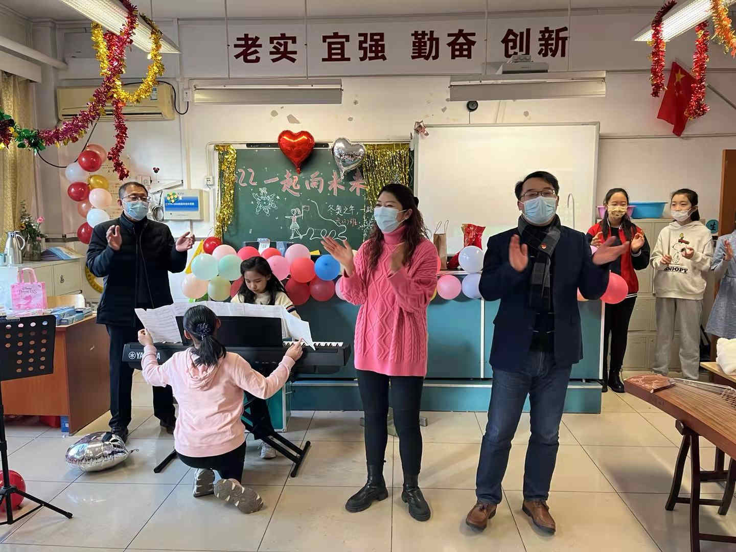 集团王松校长与行政副校长刘德印、校区主管校长张辉等领导走进各班,送上新年祝福和早早准备好的糖果,祝福孩子们2022年幸福甜蜜。随后,校领导还与孩子们一起演节目,即兴给各班学生送去慰问演出。“新年好呀!新年好呀!祝福大家新年好……”各年级组成立了新年文艺团,以年级为单位带着节目走向各班慰问,欢乐的歌声久久回荡在校园内。