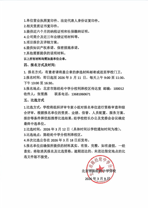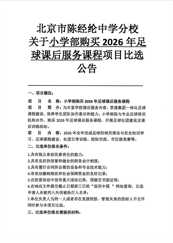 北京市陈经纶中学分校关于小学部购买2026年足球课后服务课程项目比选公告